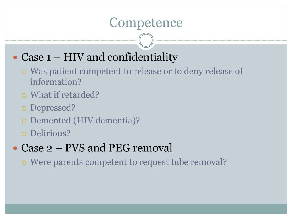 Competence • Case 1 – HIV and confidentiality • Was patient competent to release or to deny release of information? • What if retarded? • Depressed? • Demented (HIV dementia)? • Delirious? • Case 2 – PVS and PEG removal • Were parents competent to request tube removal?