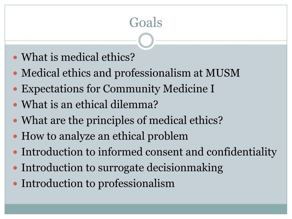 Goals • What is medical ethics? • Medical ethics and professionalism at MUSM • Expectations for Community Medicine I • What is an ethical dilemma? • What are the principles of medical ethics? • How to analyze an ethical problem • Introduction to informed consent and confidentiality • Introduction to surrogate decisionmaking • Introduction to professionalism