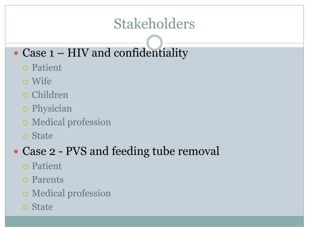 Stakeholders • Case 1 – HIV and confidentiality • Patient • Wife • Children • Physician • Medical profession • State • Case 2 - PVS and feeding tube removal • Patient • Parents • Medical profession • State