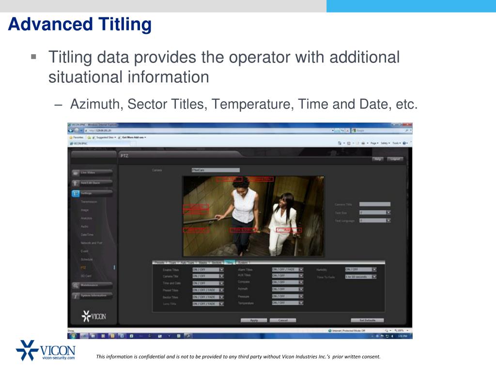 Advanced Titling • Titling data provides the operator with additional situational information • Azimuth, Sector Titles, Temperature, Time and Date, etc.