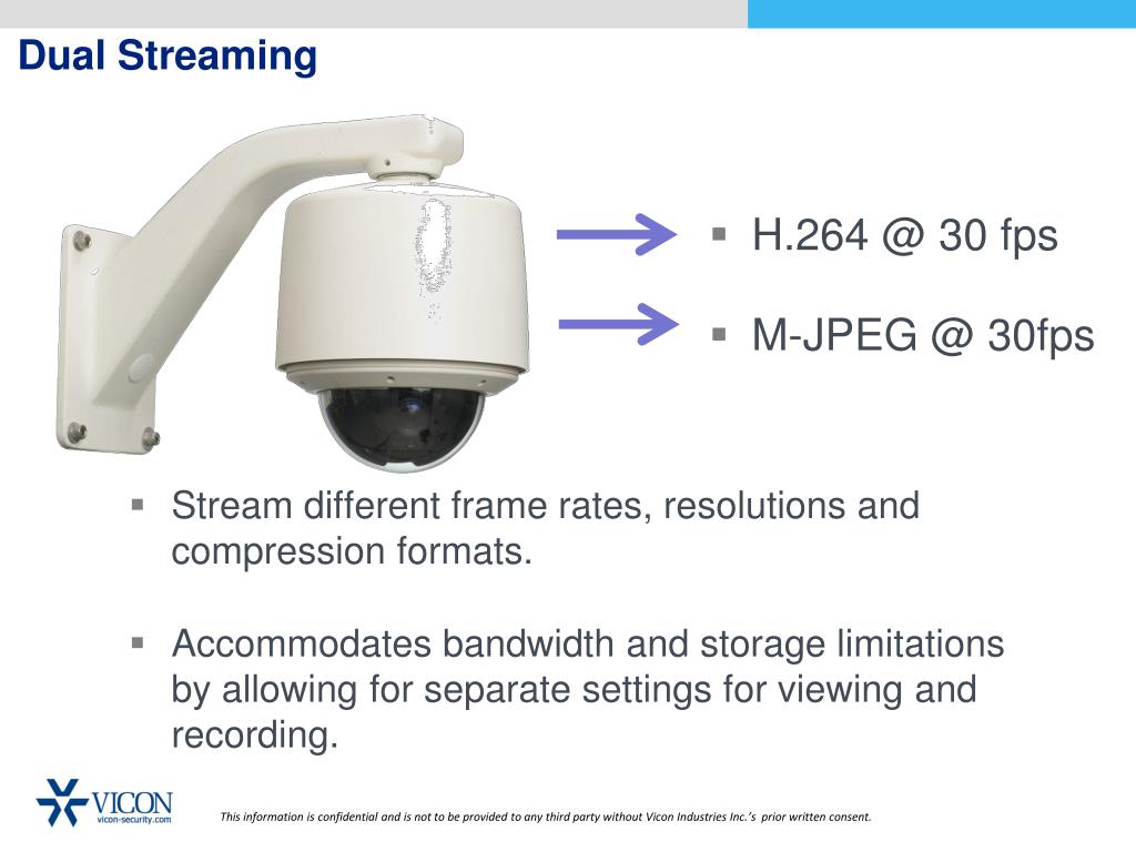 Dual Streaming • H.264 @ 30 fps • M-JPEG @ 30fps • Stream different frame rates, resolutions and compression formats. • Accommodatesbandwidth and storage limitations by allowing for separate settings for viewing and recording.