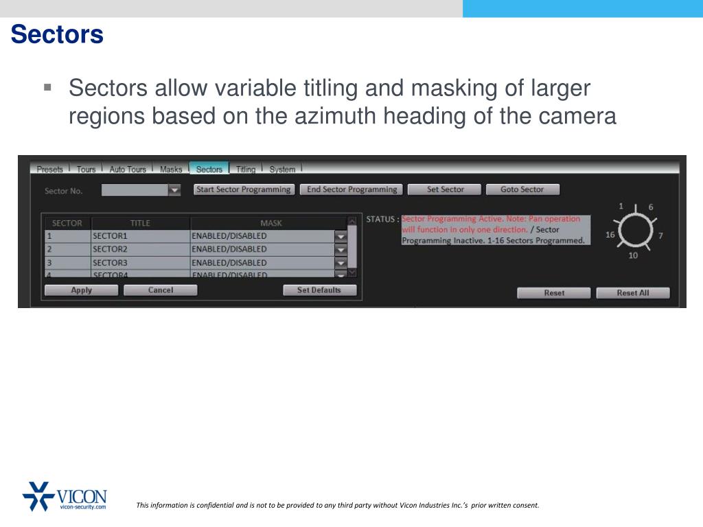 Sectors • Sectors allow variable titling and masking of larger regions based on the azimuth heading of the camera