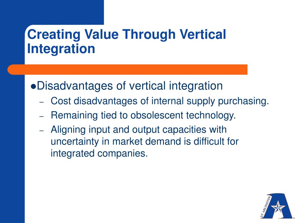 Creating Value Through Vertical Integration • Disadvantages of vertical integration • Cost disadvantages of internal supply purchasing. • Remaining tied to obsolescent technology. • Aligning input and output capacities with uncertainty in market demand is difficult for integrated companies.