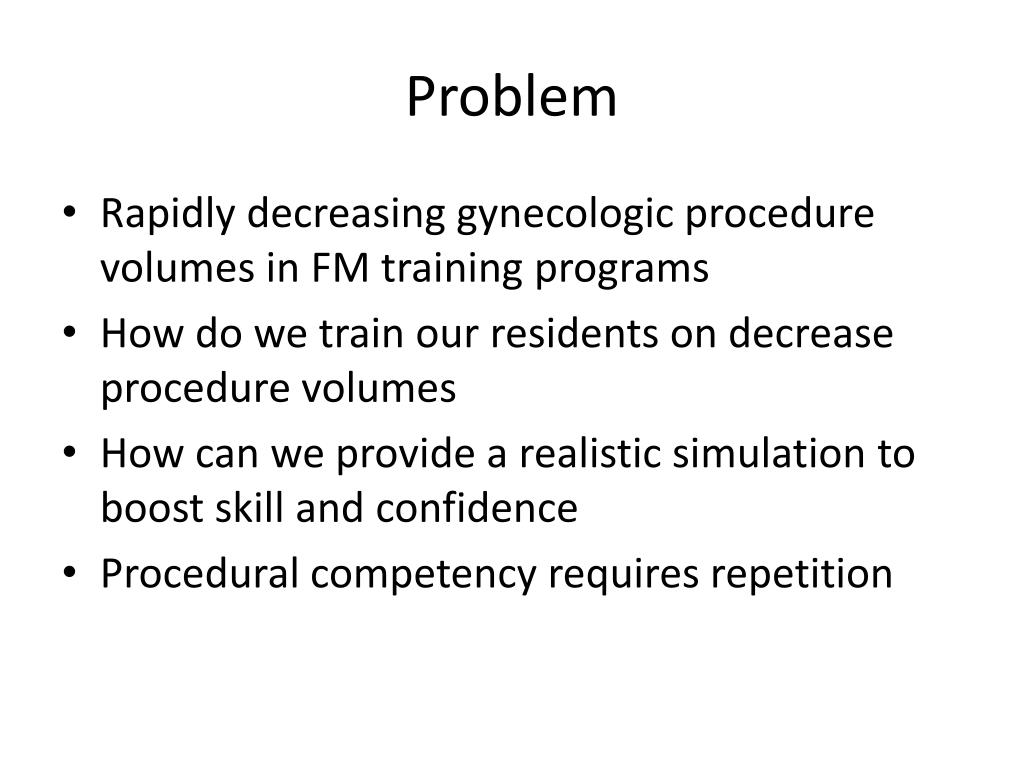 Problem • Rapidly decreasing gynecologic procedure volumes in FM training programs • How do we train our residents on decrease procedure volumes • How can we provide a realistic simulation to boost skill and confidence • Procedural competency requires repetition