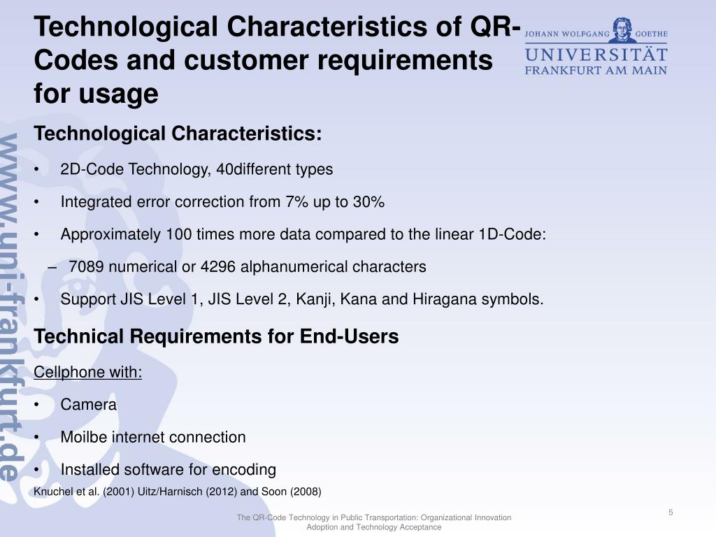 Technological Characteristics of QR-Codes and customer requirements for usage Technological Characteristics: • 2D-Code Technology, 40different types • Integrated errorcorrectionfrom 7% upto 30% • Approximately 100 timesmoredatacomparedtothe linear 1D-Code: • 7089 numericalor 4296 alphanumericalcharacters • Support JIS Level 1, JIS Level 2, Kanji, Kana and Hiragana symbols. Technical Requirementsfor End-Users Cellphonewith: • Camera • Moilbeinternetconnection • Installedsoftwareforencoding Knuchel et al. (2001) Uitz/Harnisch (2012) andSoon (2008) The QR-Code Technology in Public Transportation: Organizational Innovation Adoption and Technology Acceptance