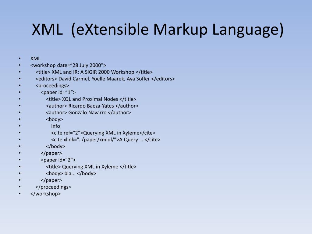 XML (eXtensible Markup Language) • XML • <workshop date=”28 July 2000”> • <title> XML and IR: A SIGIR 2000 Workshop </title> • <editors> David Carmel, YoelleMaarek, AyaSoffer </editors> • <proceedings> • <paper id=”1”> • <title> XQL and Proximal Nodes </title> • <author> Ricardo Baeza-Yates </author> • <author> Gonzalo Navarro </author> • <body> • Info • <cite ref=”2”>Querying XML in Xyleme</cite> • <cite xlink=”../paper/xmlql/”>A Query … </cite> • </body> • </paper> • <paper id=”2”> • <title> Querying XML in Xyleme </title> • <body> bla... </body> • </paper> • </proceedings> • </workshop>