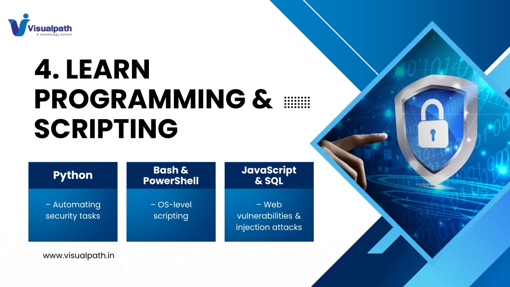 4. LEARN PROGRAMMING & SCRIPTING Bash & PowerShell JavaScript & SQL Python – Automating security tasks – OS-level scripting – Web vulnerabilities & injection attacks www.visualpath.in