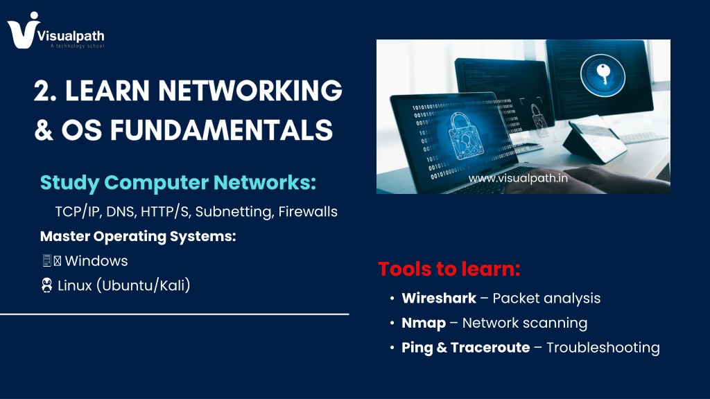 Study Computer Networks: TCP/IP, DNS, HTTP/S, Subnetting, Firewalls Master Operating Systems: ?️ Windows ? Linux (Ubuntu/Kali) www.visualpath.in Tools to learn: • Wireshark – Packet analysis • Nmap – Network scanning • Ping & Traceroute – Troubleshooting