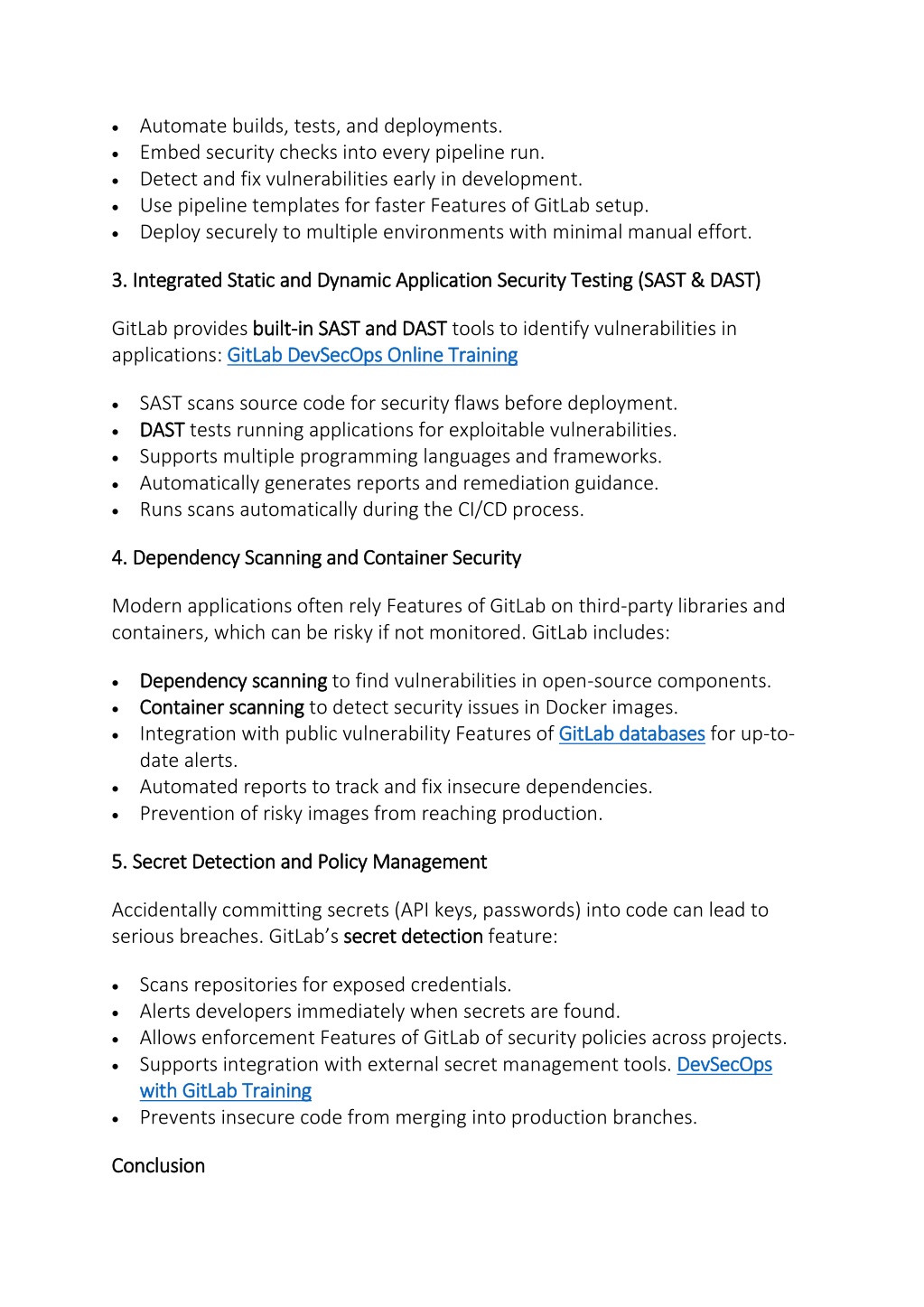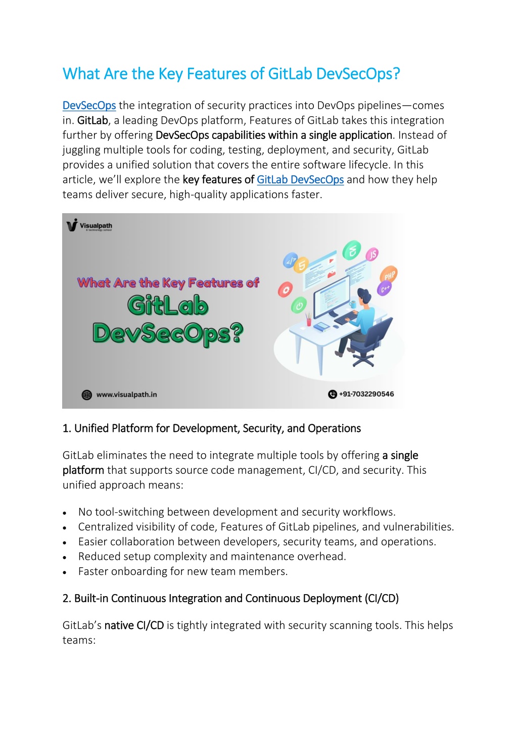 What Are the Key Features of GitLab DevSecOps? What Are the Key Features of GitLab DevSecOps? DevSecOps DevSecOps the integration of security practices into DevOps pipelines—comes in. GitLab GitLab, a leading DevOps platform, Features of GitLab takes this integration further by offering DevSecOps capabilities within a single application DevSecOps capabilities within a single application. Instead of juggling multiple tools for coding, testing, deployment, and security, GitLab provides a unified solution that covers the entire software lifecycle. In this article, we’ll explore the key features of key features of GitLab DevSecOps teams deliver secure, high-quality applications faster. GitLab DevSecOps and how they help 1. Unified Platform for Development, Security, 1. Unified Platform for Development, Security, and Operations and Operations GitLab eliminates the need to integrate multiple tools by offering a single platform platform that supports source code management, CI/CD, and security. This unified approach means: a single No tool-switching between development and security workflows. Centralized visibility of code, Features of GitLab pipelines, and vulnerabilities. Easier collaboration between developers, security teams, and operations. Reduced setup complexity and maintenance overhead. Faster onboarding for new team members. 2. Built 2. Built- -in Con in Continuous Integration and Continuous Deployment (CI/CD) tinuous Integration and Continuous Deployment (CI/CD) GitLab’s native CI/CD native CI/CD is tightly integrated with security scanning tools. This helps teams: