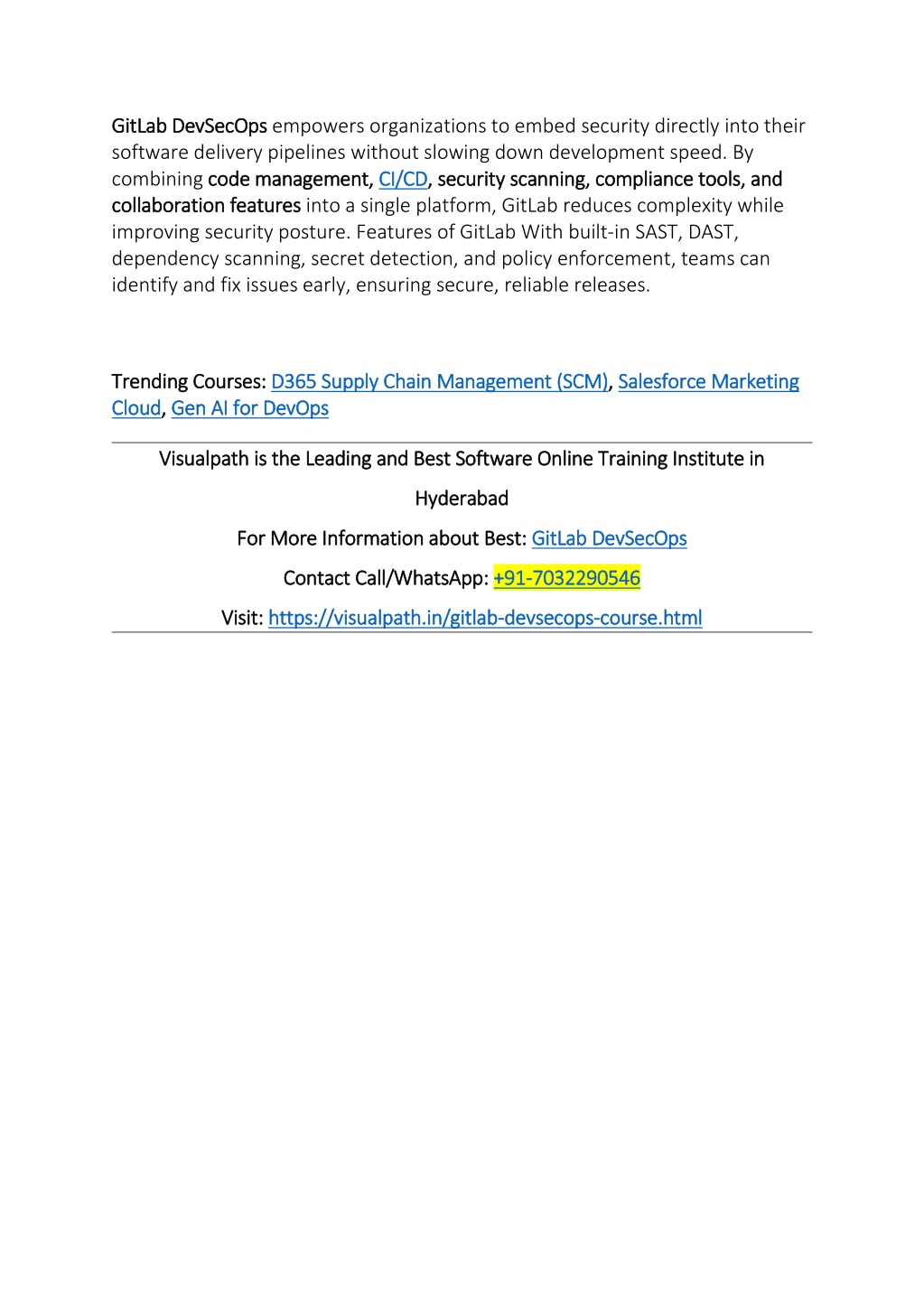 GitLab DevSecOps GitLab DevSecOps empowers organizations to embed security directly into their software delivery pipelines without slowing down development speed. By combining code management, code management, CI/CD CI/CD, security scanning, compliance tools, and , security scanning, compliance tools, and collaboration features collaboration features into a single platform, GitLab reduces complexity while improving security posture. Features of GitLab With built-in SAST, DAST, dependency scanning, secret detection, and policy enforcement, teams can identify and fix issues early, ensuring secure, reliable releases. Trending Courses: Trending Courses: D365 Supply Chain Management (SCM) D365 Supply Chain Management (SCM), , Salesforce Marketing Cloud Cloud, , Gen AI for DevOps Gen AI for DevOps Salesforce Marketing Visualpath is the Leading and Best Software Online Training Institute in Visualpath is the Leading and Best Software Online Training Institute in Hyderabad Hyderabad For More Information about For More Information about Best: Best: GitLab DevSecOps GitLab DevSecOps Contact Call/WhatsApp: Contact Call/WhatsApp: +91 +91- -7032290546 7032290546 Visit: Visit: https://visualpath.in/gitlab https://visualpath.in/gitlab- -devsecops devsecops- -course.html course.html