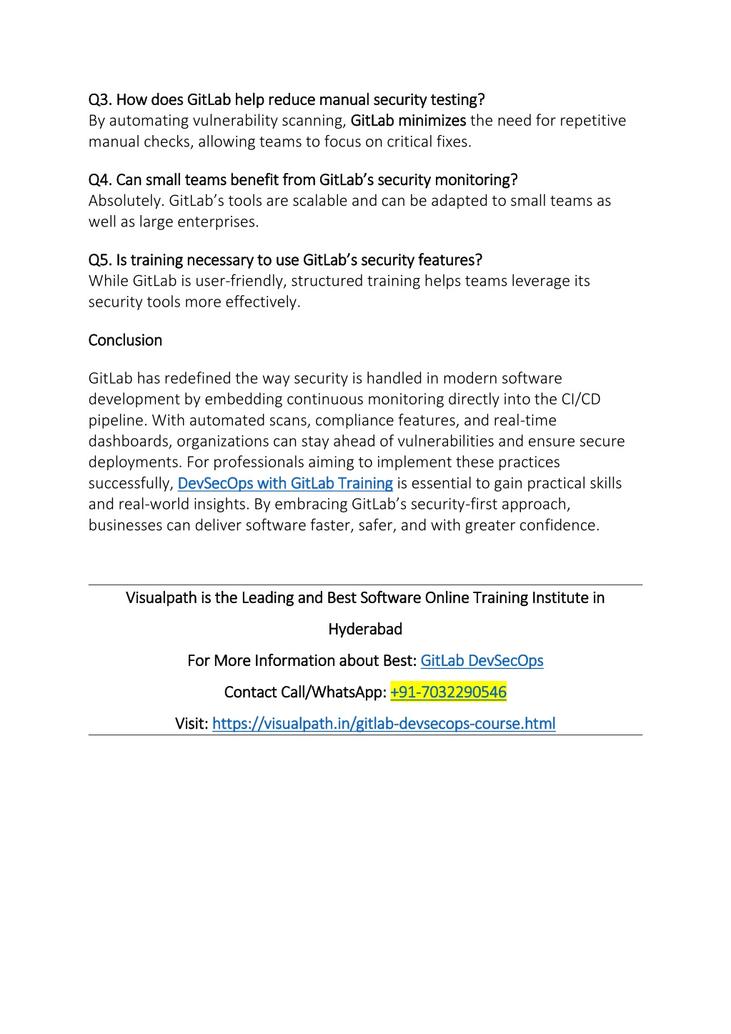 3. Q3. How does GitLab help reduce Q3. How does GitLab help reduce manual security testing? By automating vulnerability scanning, GitLab minimizes manual checks, allowing teams to focus on critical fixes. manual security testing? GitLab minimizes the need for repetitive Q4. Can small teams benefit from GitLab’s security monitoring? Q4. Can small teams benefit from GitLab’s security monitoring? Absolutely. GitLab’s tools are scalable and can be adapted to small teams as well as large enterprises. Q5. Is training necessary to use GitLab’s security features? Q5. Is training necessary to use GitLab’s security features? While GitLab is user-friendly, structured training helps teams leverage its security tools more effectively. Co Conclusion nclusion GitLab has redefined the way security is handled in modern software development by embedding continuous monitoring directly into the CI/CD pipeline. With automated scans, compliance features, and real-time dashboards, organizations can stay ahead of vulnerabilities and ensure secure deployments. For professionals aiming to implement these practices successfully, DevSecOps with GitLab Training DevSecOps with GitLab Training is essential to gain practical skills and real-world insights. By embracing GitLab’s security-first approach, businesses can deliver software faster, safer, and with greater confidence. Visualpath is the Leading and Best Software Online Training Institute in Visualpath is the Leading and Best Software Online Training Institute in Hyderabad Hyderabad For More Information about Best: For More Information about Best: GitLab DevSecOps GitLab DevSecOps Contact Call/WhatsApp: Contact Call/WhatsApp: +91 +91- -7032290546 7032290546 Visit: Visit: https://visualpath.in/gitlab https://visualpath.in/gitlab- -devsecops devsecops- -course.html course.html