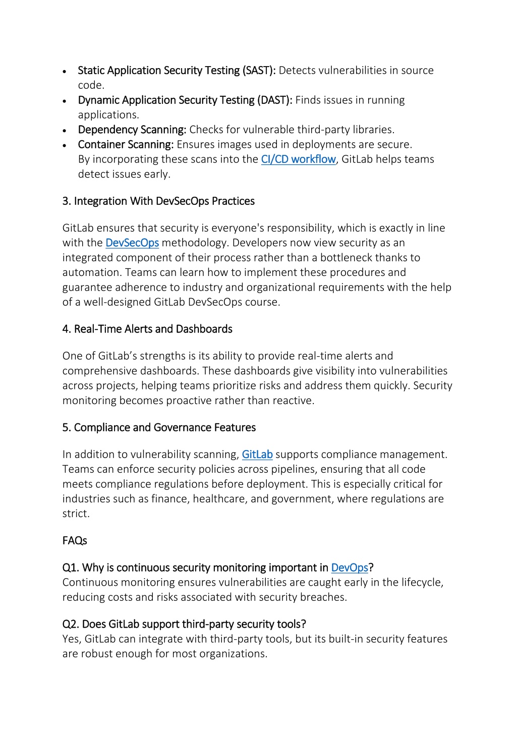 2. Static Application Security Testing (SAST): Static Application Security Testing (SAST): Detects vulnerabilities in source code. Dynamic Application Security Testing (DAST): Dynamic Application Security Testing (DAST): Finds issues in running applications. Dependency Scanning: Dependency Scanning: Checks for vulnerable third-party libraries. Container Scanning: Container Scanning: Ensures images used in deployments are secure. By incorporating these scans into the CI/CD workflow detect issues early. CI/CD workflow, GitLab helps teams 3. Integration With DevSecOps Practices 3. Integration With DevSecOps Practices GitLab ensures that security is everyone's responsibility, which is exactly in line with the DevSecOps DevSecOps methodology. Developers now view security as an integrated component of their process rather than a bottleneck thanks to automation. Teams can learn how to implement these procedures and guarantee adherence to industry and organizational requirements with the help of a well-designed GitLab DevSecOps course. 4. Real 4. Real- -Time Alerts and Dashboards Time Alerts and Dashboards One of GitLab’s strengths is its ability to provide real-time alerts and comprehensive dashboards. These dashboards give visibility into vulnerabilities across projects, helping teams prioritize risks and address them quickly. Security monitoring becomes proactive rather than reactive. 5. Compliance and Governance Features 5. Compliance and Governance Features In addition to vulnerability scanning, GitLab Teams can enforce security policies across pipelines, ensuring that all code meets compliance regulations before deployment. This is especially critical for industries such as finance, healthcare, and government, where regulations are strict. GitLab supports compliance management. FAQs FAQs Q1. Why is continuous security monitoring important in Q1. Why is continuous security monitoring important in DevOps Continuous monitoring ensures vulnerabilities are caught early in the lifecycle, reducing costs and risks associated with security breaches. DevOps? ? Q2. Does GitLab support third Q2. Does GitLab support third- -party security tools? Yes, GitLab can integrate with third-party tools, but its built-in security features are robust enough for most organizations. party security tools?