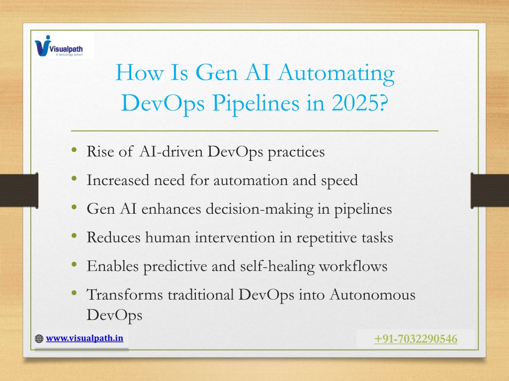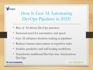 Join Visualpathu2019s Advanced Gen AI For DevOps and gain practical, hands-on skills from industry experts. Our Generative AI For DevOps Training Hyderabad blends advanced AI techniques with real-world DevOps practices to give your career a competitive edge. Training is available online and at our centers in Pune, Bangalore, and Chennai. For more information, call 91-7032290546 today.<br>Visit: https://www.visualpath.in/generative-ai-for-devops-online-training.html <br>WhatsApp: https://wa.me/c/917032290546 <br>Visit Blog: https://visualpathblogs.com/category/gen-ai-for-devops/<br>