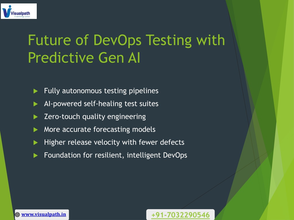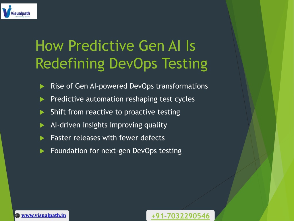 1. How Predictive Gen AI Is Redefining DevOps Testing • Rise of Gen AI–powered DevOps transformations • Predictive automation reshaping test cycles • Shift from reactive to proactive testing • AI-driven insights improving quality • Faster releases with fewer defects • Foundation for next-gen DevOps testing +91-7032290546