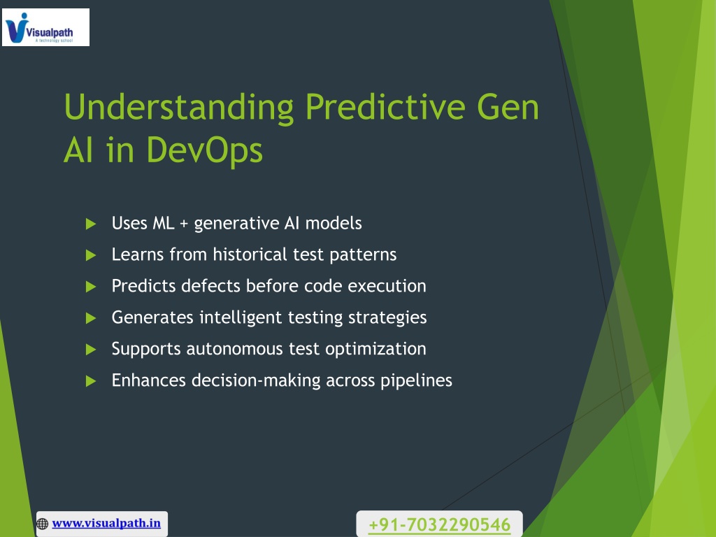 2. Understanding Predictive Gen AI in DevOps • Uses ML + generative AI models • Learns from historical test patterns • Predicts defects before code execution • Generates intelligent testing strategies • Supports autonomous test optimization • Enhances decision-making across pipelines +91-7032290546