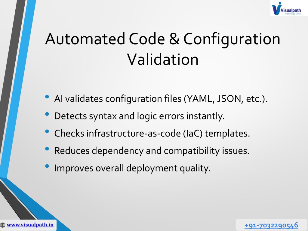 Automated Code & Configuration Validation • AI validates configuration files (YAML, JSON, etc.). • Detects syntax and logic errors instantly. • Checks infrastructure-as-code (IaC) templates. • Reduces dependency and compatibility issues. • Improves overall deployment quality. +91-7032290546
