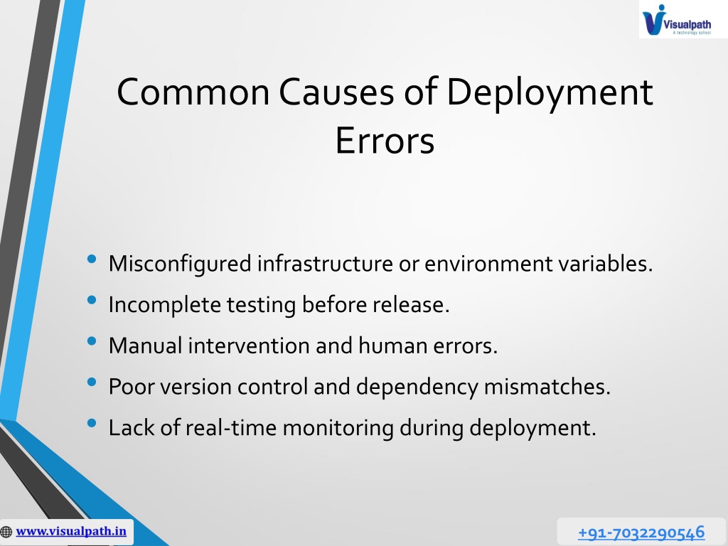 Common Causes of Deployment Errors • Misconfigured infrastructure or environment variables. • Incomplete testing before release. • Manual intervention and human errors. • Poor version control and dependency mismatches. • Lack of real-time monitoring during deployment. +91-7032290546