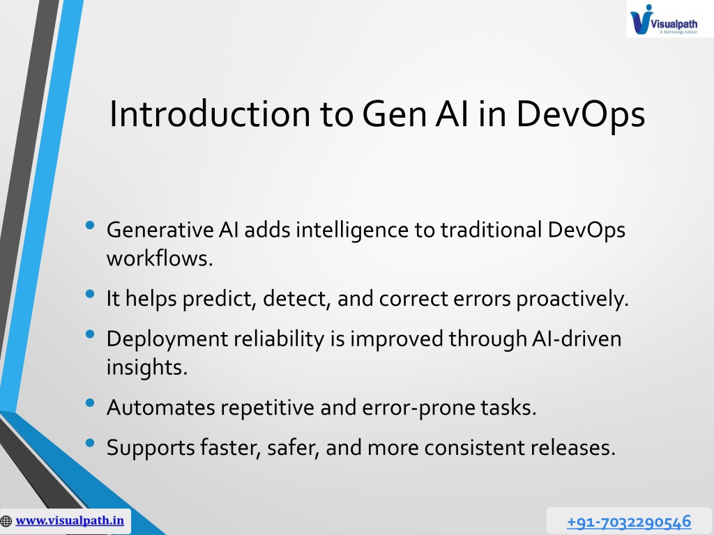 Introduction to Gen AI in DevOps • Generative AI adds intelligence to traditional DevOps workflows. • It helps predict, detect, and correct errors proactively. • Deployment reliability is improved through AI-driven insights. • Automates repetitive and error-prone tasks. • Supports faster, safer, and more consistent releases. +91-7032290546