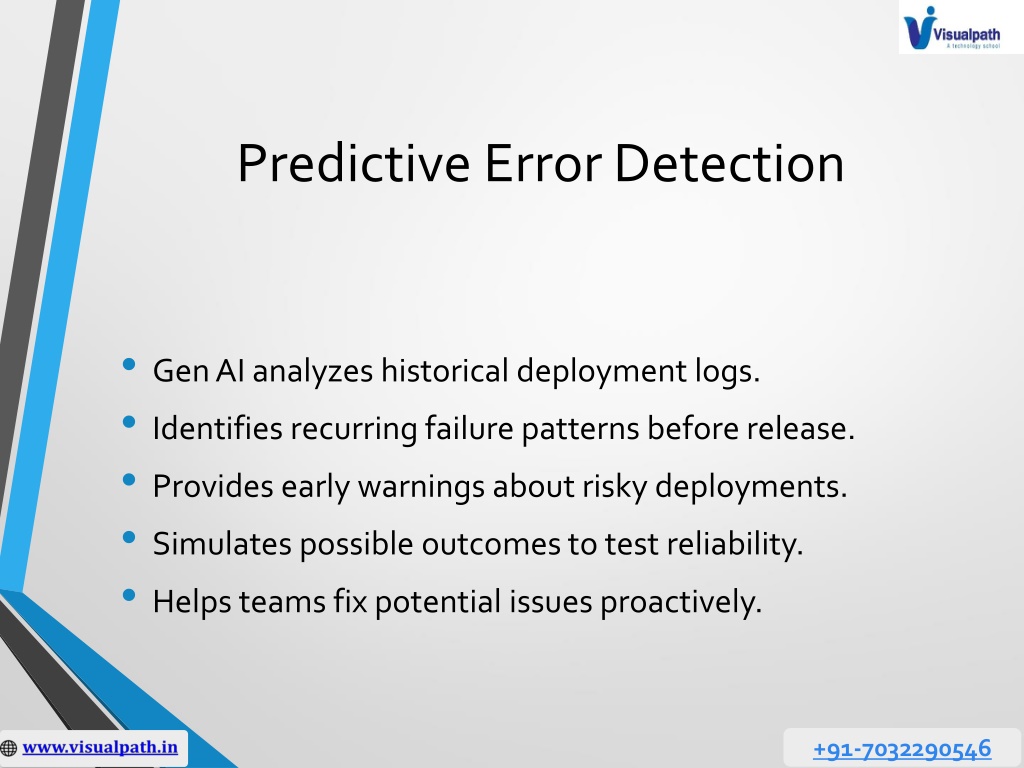 Predictive Error Detection • Gen AI analyzes historical deployment logs. • Identifies recurring failure patterns before release. • Provides early warnings about risky deployments. • Simulates possible outcomes to test reliability. • Helps teams fix potential issues proactively. +91-7032290546