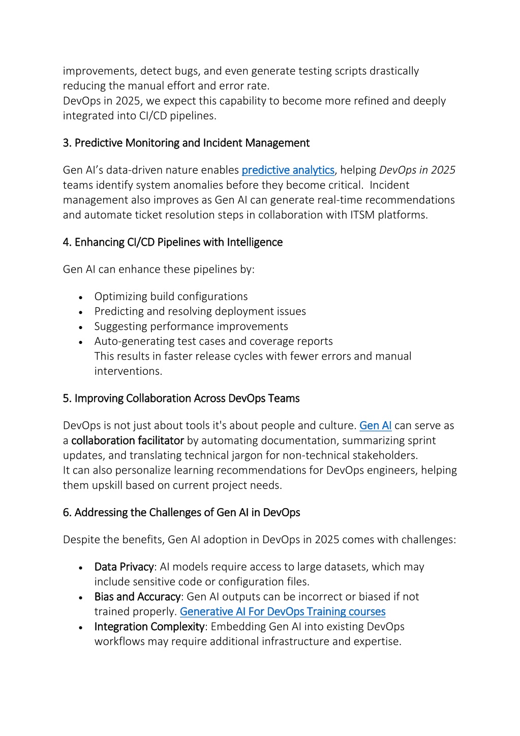 improvements, detect bugs, and even generate testing scripts drastically reducing the manual effort and error rate. DevOps in 2025, we expect this capability to become more refined and deeply integrated into CI/CD pipelines. 3. Predictive Monitoring and Incident Management 3. Predictive Monitoring and Incident Management Gen AI’s data-driven nature enables predictive analytics teams identify system anomalies before they become critical. Incident management also improves as Gen AI can generate real-time recommendations and automate ticket resolution steps in collaboration with ITSM platforms. predictive analytics, helping DevOps in 2025 4. Enhancing CI/CD Pipelines with I 4. Enhancing CI/CD Pipelines with Intelligence ntelligence Gen AI can enhance these pipelines by: Optimizing build configurations Predicting and resolving deployment issues Suggesting performance improvements Auto-generating test cases and coverage reports This results in faster release cycles with fewer errors and manual interventions. 5. Improving Collaboration Across DevOps Teams 5. Improving Collaboration Across DevOps Teams DevOps is not just about tools it's about people and culture. Gen AI a c collaboration facilitator ollaboration facilitator by automating documentation, summarizing sprint updates, and translating technical jargon for non-technical stakeholders. It can also personalize learning recommendations for DevOps engineers, helping them upskill based on current project needs. Gen AI can serve as 6. Addressing the Challenges of Gen AI in DevOps 6. Addressing the Challenges of Gen AI in DevOps Despite the benefits, Gen AI adoption in DevOps in 2025 comes with challenges: Data Privacy Data Privacy: AI models require access to large datasets, which may include sensitive code or configuration files. Bias and Accuracy Bias and Accuracy: Gen AI outputs can be incorrect or biased if not trained properly. Generative AI For DevOps Training courses Generative AI For DevOps Training courses Integration Complexity Integration Complexity: Embedding Gen AI into existing DevOps workflows may require additional infrastructure and expertise.