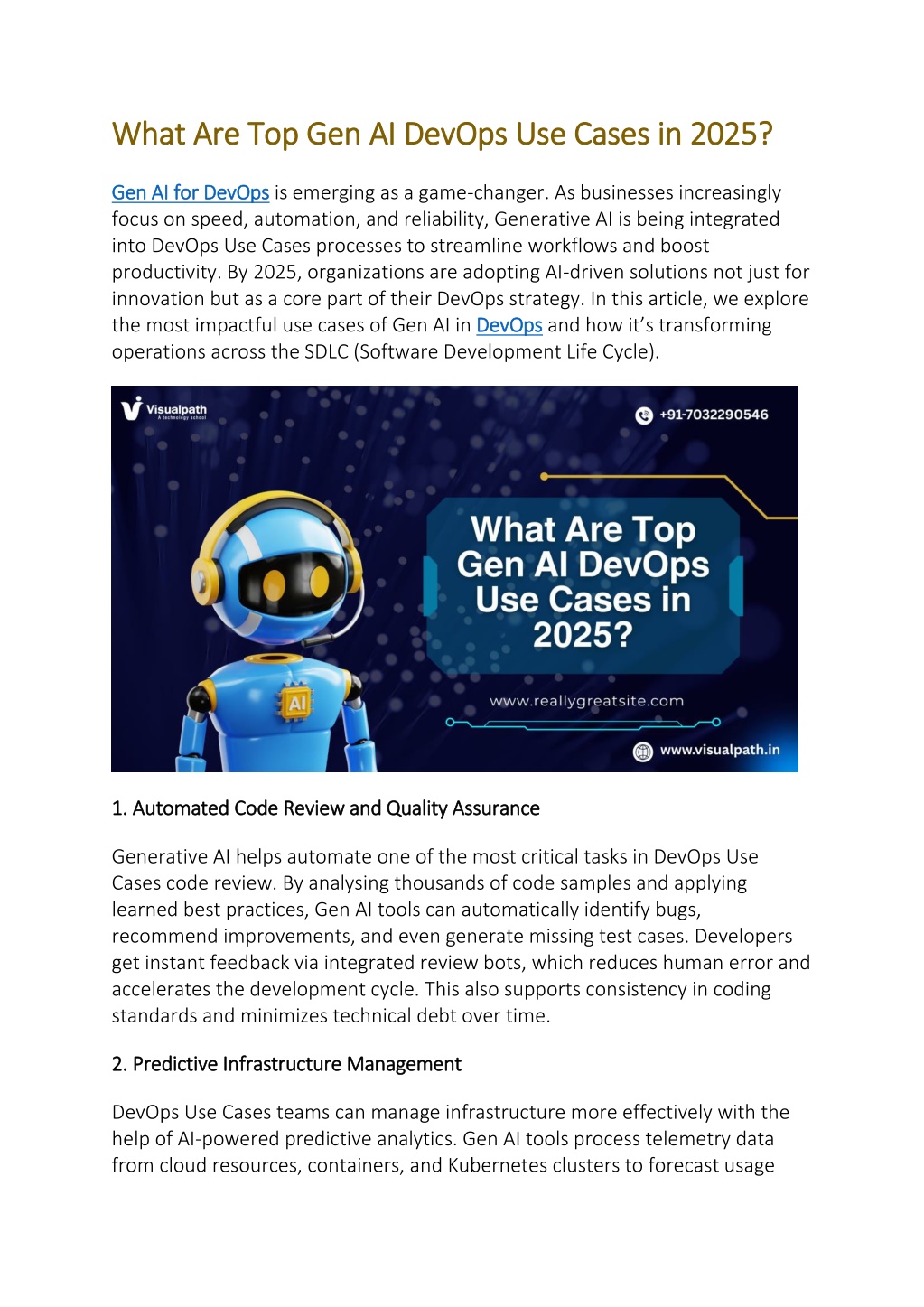 What Are Top Gen AI DevOps Use Cases in 2025? What Are Top Gen AI DevOps Use Cases in 2025? Gen AI for DevOps Gen AI for DevOps is emerging as a game-changer. As businesses increasingly focus on speed, automation, and reliability, Generative AI is being integrated into DevOps Use Cases processes to streamline workflows and boost productivity. By 2025, organizations are adopting AI-driven solutions not just for innovation but as a core part of their DevOps strategy. In this article, we explore the most impactful use cases of Gen AI in DevOps operations across the SDLC (Software Development Life Cycle). DevOps and how it’s transforming 1. Automated Code Review and Quality Assurance 1. Automated Code Review and Quality Assurance Generative AI helps automate one of the most critical tasks in DevOps Use Cases code review. By analysing thousands of code samples and applying learned best practices, Gen AI tools can automatically identify bugs, recommend improvements, and even generate missing test cases. Developers get instant feedback via integrated review bots, which reduces human error and accelerates the development cycle. This also supports consistency in coding standards and minimizes technical debt over time. 2. Predictive Infrastructure Management 2. Predictive Infrastructure Management DevOps Use Cases teams can manage infrastructure more effectively with the help of AI-powered predictive analytics. Gen AI tools process telemetry data from cloud resources, containers, and Kubernetes clusters to forecast usage