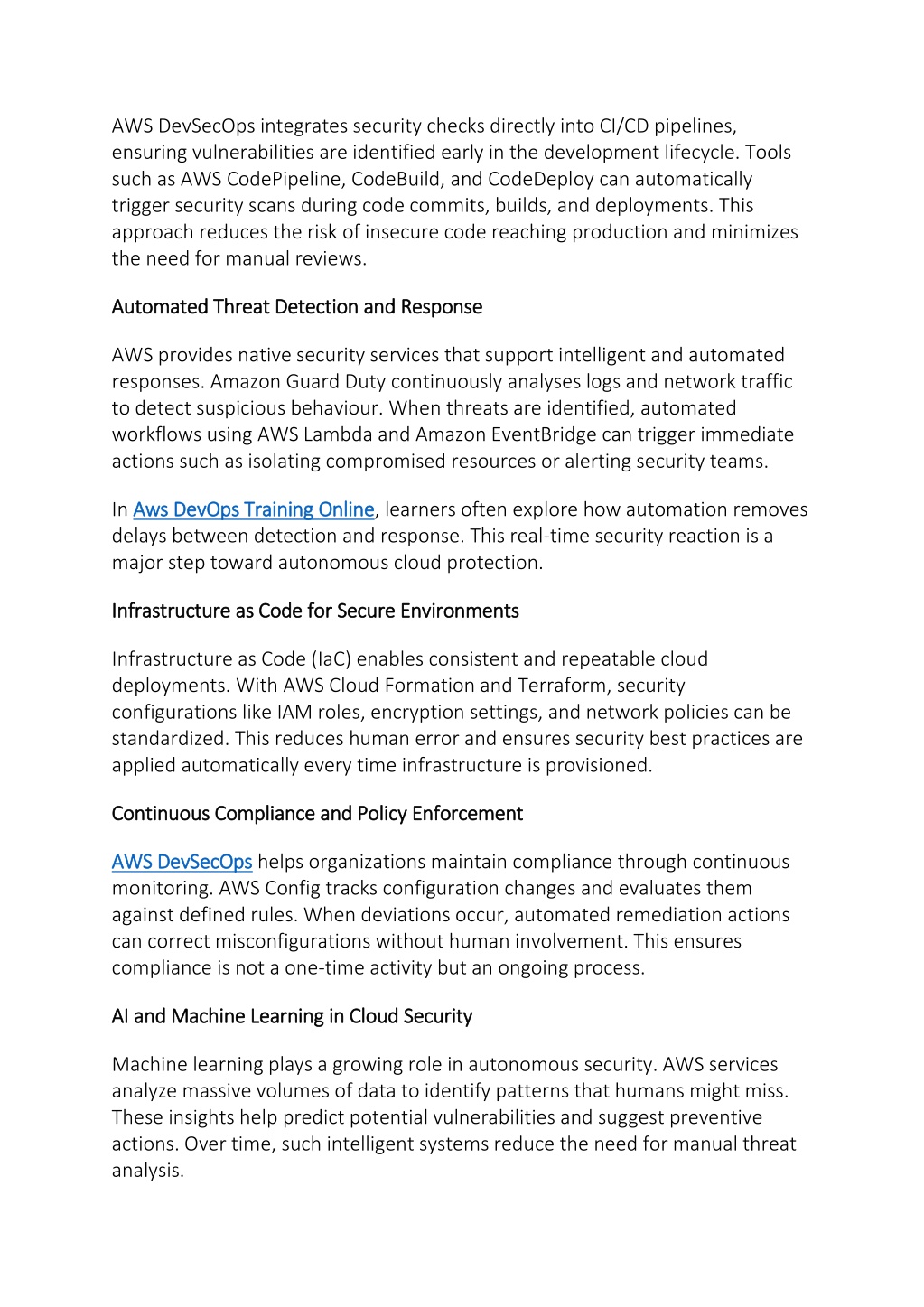 AWS DevSecOps integrates security checks directly into CI/CD pipelines, ensuring vulnerabilities are identified early in the development lifecycle. Tools such as AWS CodePipeline, CodeBuild, and CodeDeploy can automatically trigger security scans during code commits, builds, and deployments. This approach reduces the risk of insecure code reaching production and minimizes the need for manual reviews. Automated Threat Detection and Response Automated Threat Detection and Response AWS provides native security services that support intelligent and automated responses. Amazon Guard Duty continuously analyses logs and network traffic to detect suspicious behaviour. When threats are identified, automated workflows using AWS Lambda and Amazon EventBridge can trigger immediate actions such as isolating compromised resources or alerting security teams. In Aws DevOps Training Online Aws DevOps Training Online, learners often explore how automation removes delays between detection and response. This real-time security reaction is a major step toward autonomous cloud protection. Infrastructure as Code for Secure Environments Infrastructure as Code for Secure Environments Infrastructure as Code (IaC) enables consistent and repeatable cloud deployments. With AWS Cloud Formation and Terraform, security configurations like IAM roles, encryption settings, and network policies can be standardized. This reduces human error and ensures security best practices are applied automatically every time infrastructure is provisioned. Continuous Compliance and Policy Enforcement Continuous Compliance and Policy Enforcement AWS DevSecOps AWS DevSecOps helps organizations maintain compliance through continuous monitoring. AWS Config tracks configuration changes and evaluates them against defined rules. When deviations occur, automated remediation actions can correct misconfigurations without human involvement. This ensures compliance is not a one-time activity but an ongoing process. AI and Machine Learning in Cloud Security AI and Machine Learning in Cloud Security Machine learning plays a growing role in autonomous security. AWS services analyze massive volumes of data to identify patterns that humans might miss. These insights help predict potential vulnerabilities and suggest preventive actions. Over time, such intelligent systems reduce the need for manual threat analysis.