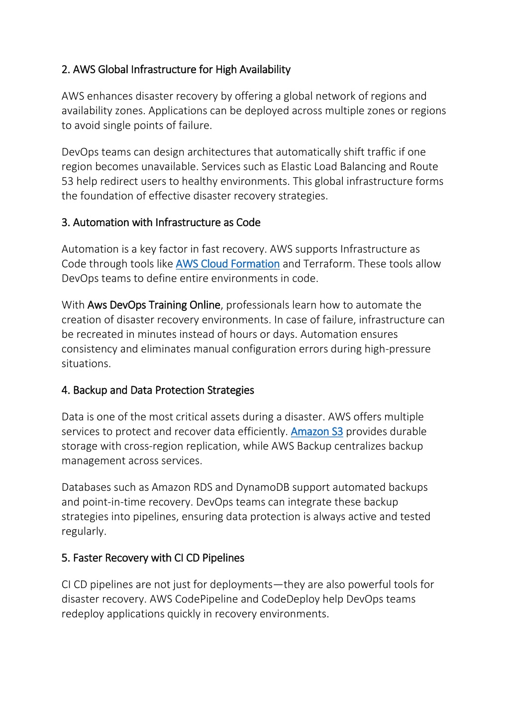 2. AWS Global Infrastructure for High Availability 2. AWS Global Infrastructure for High Availability AWS enhances disaster recovery by offering a global network of regions and availability zones. Applications can be deployed across multiple zones or regions to avoid single points of failure. DevOps teams can design architectures that automatically shift traffic if one region becomes unavailable. Services such as Elastic Load Balancing and Route 53 help redirect users to healthy environments. This global infrastructure forms the foundation of effective disaster recovery strategies. 3. Automation with Infrastructure as Code 3. Automation with Infrastructure as Code Automation is a key factor in fast recovery. AWS supports Infrastructure as Code through tools like AWS Cloud Formation AWS Cloud Formation and Terraform. These tools allow DevOps teams to define entire environments in code. With Aws DevOps Training Online Aws DevOps Training Online, professionals learn how to automate the creation of disaster recovery environments. In case of failure, infrastructure can be recreated in minutes instead of hours or days. Automation ensures consistency and eliminates manual configuration errors during high-pressure situations. 4. Backup and Data Protection Strategies 4. Backup and Data Protection Strategies Data is one of the most critical assets during a disaster. AWS offers multiple services to protect and recover data efficiently. Amazon S3 storage with cross-region replication, while AWS Backup centralizes backup management across services. Amazon S3 provides durable Databases such as Amazon RDS and DynamoDB support automated backups and point-in-time recovery. DevOps teams can integrate these backup strategies into pipelines, ensuring data protection is always active and tested regularly. 5. Faste 5. Faster Recovery with CI CD Pipelines r Recovery with CI CD Pipelines CI CD pipelines are not just for deployments—they are also powerful tools for disaster recovery. AWS CodePipeline and CodeDeploy help DevOps teams redeploy applications quickly in recovery environments.
