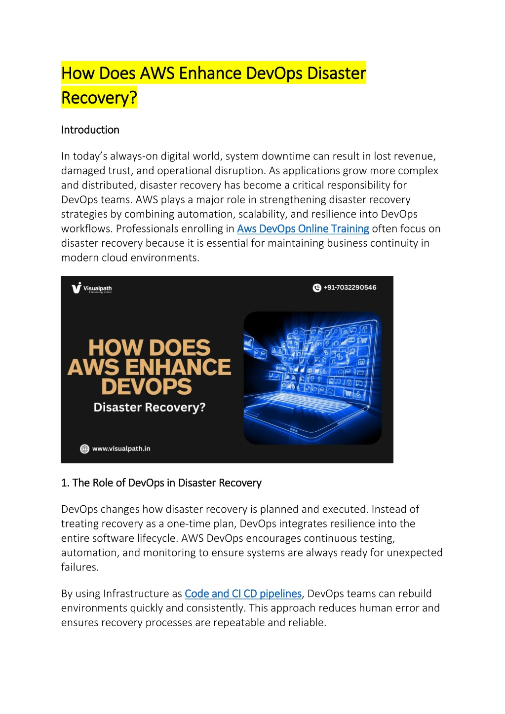 How Does AWS Enhance DevOps Disaster How Does AWS Enhance DevOps Disaster Recovery? Recovery? Introduction Introduction In today’s always-on digital world, system downtime can result in lost revenue, damaged trust, and operational disruption. As applications grow more complex and distributed, disaster recovery has become a critical responsibility for DevOps teams. AWS plays a major role in strengthening disaster recovery strategies by combining automation, scalability, and resilience into DevOps workflows. Professionals enrolling in Aws DevOps Online Training Aws DevOps Online Training often focus on disaster recovery because it is essential for maintaining business continuity in modern cloud environments. 1. The Role of DevOps in Disaster Recovery 1. The Role of DevOps in Disaster Recovery DevOps changes how disaster recovery is planned and executed. Instead of treating recovery as a one-time plan, DevOps integrates resilience into the entire software lifecycle. AWS DevOps encourages continuous testing, automation, and monitoring to ensure systems are always ready for unexpected failures. By using Infrastructure as Code and CI CD pipelines environments quickly and consistently. This approach reduces human error and ensures recovery processes are repeatable and reliable. Code and CI CD pipelines, DevOps teams can rebuild