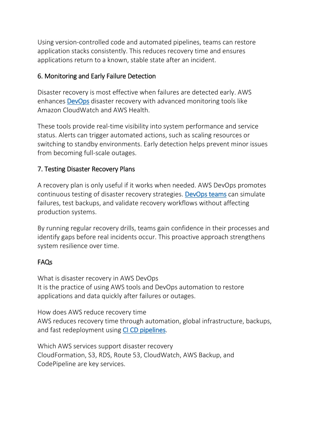 Using version-controlled code and automated pipelines, teams can restore application stacks consistently. This reduces recovery time and ensures applications return to a known, stable state after an incident. 6. Monitoring and Early Failure Detection 6. Monitoring and Early Failure Detection Disaster recovery is most effective when failures are detected early. AWS enhances DevOps DevOps disaster recovery with advanced monitoring tools like Amazon CloudWatch and AWS Health. These tools provide real-time visibility into system performance and service status. Alerts can trigger automated actions, such as scaling resources or switching to standby environments. Early detection helps prevent minor issues from becoming full-scale outages. 7. T 7. Testing Disaster Recovery Plans esting Disaster Recovery Plans A recovery plan is only useful if it works when needed. AWS DevOps promotes continuous testing of disaster recovery strategies. DevOps te failures, test backups, and validate recovery workflows without affecting production systems. DevOps teams ams can simulate By running regular recovery drills, teams gain confidence in their processes and identify gaps before real incidents occur. This proactive approach strengthens system resilience over time. FAQs FAQs What is disaster recovery in AWS DevOps It is the practice of using AWS tools and DevOps automation to restore applications and data quickly after failures or outages. How does AWS reduce recovery time AWS reduces recovery time through automation, global infrastructure, backups, and fast redeployment using CI CD pipelines CI CD pipelines. Which AWS services support disaster recovery CloudFormation, S3, RDS, Route 53, CloudWatch, AWS Backup, and CodePipeline are key services.