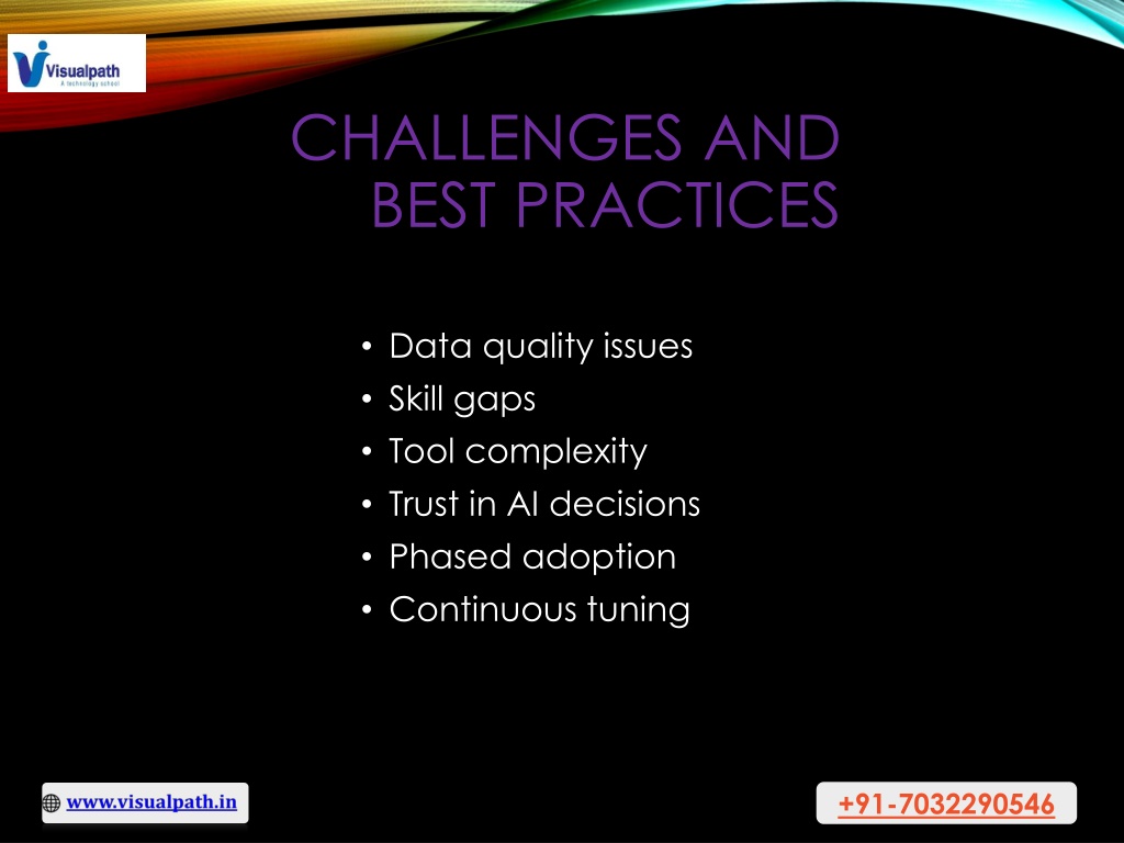 Challenges and Best Practices • Data quality issues • Skill gaps • Tool complexity • Trust in AI decisions • Phased adoption • Continuous tuning +91-7032290546