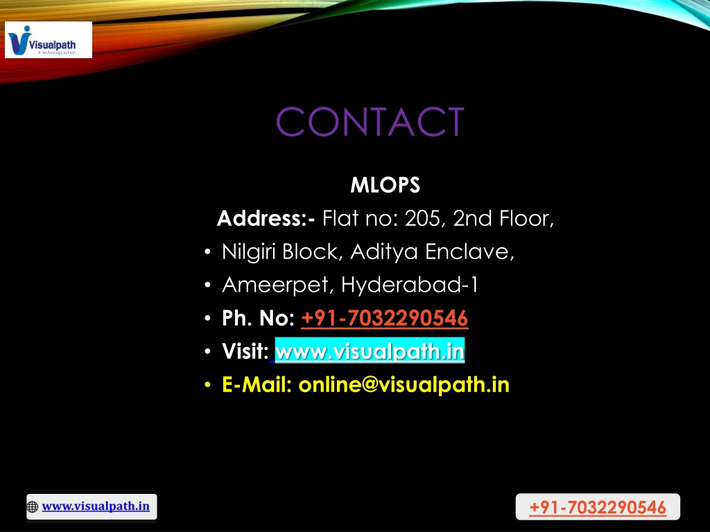 Contact MLOPS Address:- Flat no: 205, 2nd Floor, • Nilgiri Block, Aditya Enclave, • Ameerpet, Hyderabad-1 • Ph. No: +91-7032290546 • Visit:www.visualpath.in • E-Mail: online@visualpath.in +91-7032290546