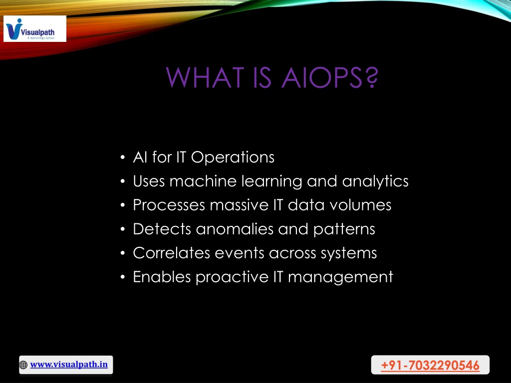 What Is AIOps? • AI for IT Operations • Uses machine learning and analytics • Processes massive IT data volumes • Detects anomalies and patterns • Correlates events across systems • Enables proactive IT management +91-7032290546