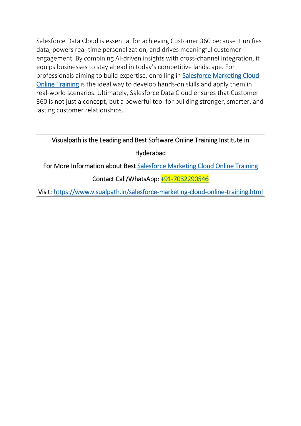 3. Salesforce Data Cloud is essential for achieving Customer 360 because it unifies data, powers real-time personalization, and drives meaningful customer engagement. By combining AI-driven insights with cross-channel integration, it equips businesses to stay ahead in today’s competitive landscape. For professionals aiming to build expertise, enrolling in Salesforce Marketing Cl Online Training Online Training is the ideal way to develop hands-on skills and apply them in real-world scenarios. Ultimately, Salesforce Data Cloud ensures that Customer 360 is not just a concept, but a powerful tool for building stronger, smarter, and lasting customer relationships. Salesforce Marketing Cloud oud Visualpath is the Leading and Best Software Online Training Institute in Visualpath is the Leading and Best Software Online Training Institute in Hyderabad Hyderabad For More Information about Best For More Information about Best Salesforce Marketing Cloud Online Training Salesforce Marketing Cloud Online Training Contact Call/WhatsApp: Contact Call/WhatsApp: +91 +91- -7032290546 7032290546 Visit: Visit: https://www.visualpath.in/salesforce https://www.visualpath.in/salesforce- -marketing marketing- -cloud cloud- -online online- -training.html training.html