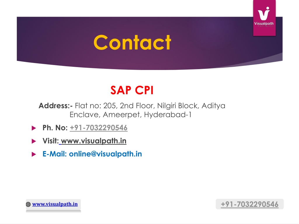 SAP CPI Address:- Flat no: 205, 2nd Floor,Nilgiri Block, Aditya Enclave,Ameerpet, Hyderabad-1 Ph. No: +91-7032290546 Visit:www.visualpath.in E-Mail: online@visualpath.in Contact +91-7032290546