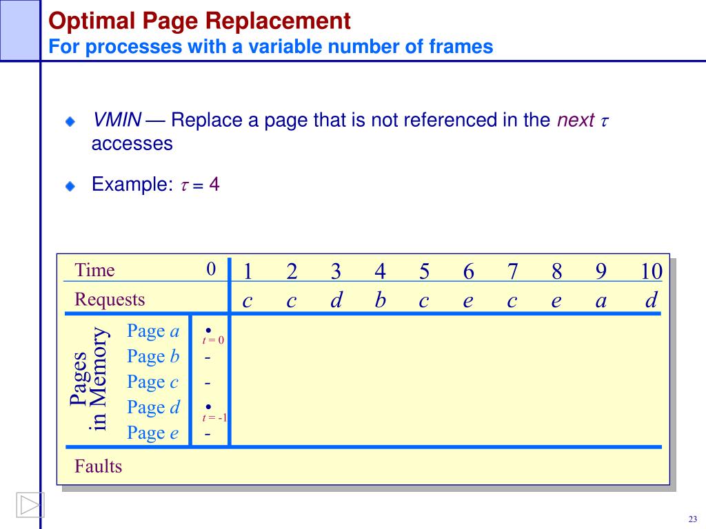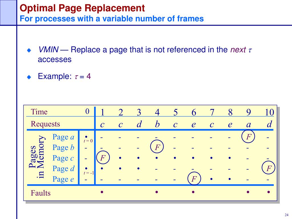 Optimal Page ReplacementFor processes with a variable number of frames • VMIN — Replace a page that is not referenced in the next accesses • Example: =4 0 1 2 3 4 5 6 7 8 9 10 Time c c d b c e c e a d Requests Page a • - - - - - - - - F - t = 0 Page b - - - - F - - - - - - Pages in Memory Page c - F • • • • • • • - - Page d • • • • - - - - - - F t = -1 Page e - - - - - - F • • - - •• • • • Faults