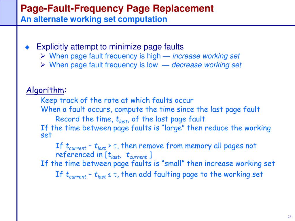 Page-Fault-Frequency Page ReplacementAn alternate working set computation • Explicitly attempt to minimize page faults • When page fault frequency is high — increaseworkingset • When page fault frequency is low — decreaseworkingset • Algorithm: • Keep track of the rate at which faults occur • When a fault occurs, compute the time since the last page fault • Record the time, tlast, of the last page fault • If the time between page faults is “large” then reduce the working set • If tcurrent – tlast > , then remove from memory all pages not referenced in [tlast, tcurrent ] • If the time between page faults is “small” then increase working set • If tcurrent – tlast ≤ , then add faulting page to the working set