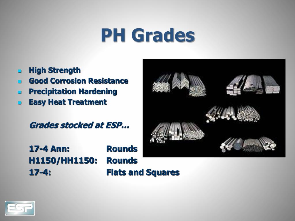 PH Grades • High Strength • Good Corrosion Resistance • Precipitation Hardening • Easy Heat Treatment Grades stocked at ESP… 17-4 Ann: Rounds H1150/HH1150: Rounds 17-4: Flats and Squares