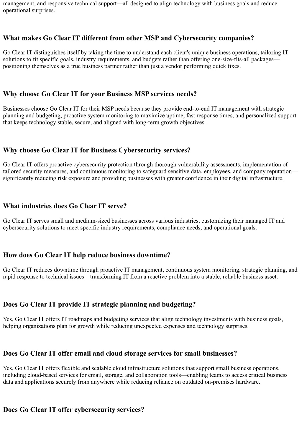 management, and responsive technical support—all designed to align technology with business goals and reduce operational surprises. What makes Go Clear IT different from other MSP and Cybersecurity companies? Go Clear IT distinguishes itself by taking the time to understand each client's unique business operations, tailoring IT solutions to fit specific goals, industry requirements, and budgets rather than offering one-size-fits-all packages— positioning themselves as a true business partner rather than just a vendor performing quick fixes. Why choose Go Clear IT for your Business MSP services needs? Businesses choose Go Clear IT for their MSP needs because they provide end-to-end IT management with strategic planning and budgeting, proactive system monitoring to maximize uptime, fast response times, and personalized support that keeps technology stable, secure, and aligned with long-term growth objectives. Why choose Go Clear IT for Business Cybersecurity services? Go Clear IT offers proactive cybersecurity protection through thorough vulnerability assessments, implementation of tailored security measures, and continuous monitoring to safeguard sensitive data, employees, and company reputation— significantly reducing risk exposure and providing businesses with greater confidence in their digital infrastructure. What industries does Go Clear IT serve? Go Clear IT serves small and medium-sized businesses across various industries, customizing their managed IT and cybersecurity solutions to meet specific industry requirements, compliance needs, and operational goals. How does Go Clear IT help reduce business downtime? Go Clear IT reduces downtime through proactive IT management, continuous system monitoring, strategic planning, and rapid response to technical issues—transforming IT from a reactive problem into a stable, reliable business asset. Does Go Clear IT provide IT strategic planning and budgeting? Yes, Go Clear IT offers IT roadmaps and budgeting services that align technology investments with business goals, helping organizations plan for growth while reducing unexpected expenses and technology surprises. Does Go Clear IT offer email and cloud storage services for small businesses? Yes, Go Clear IT offers flexible and scalable cloud infrastructure solutions that support small business operations, including cloud-based services for email, storage, and collaboration tools—enabling teams to access critical business data and applications securely from anywhere while reducing reliance on outdated on-premises hardware. Does Go Clear IT offer cybersecurity services?