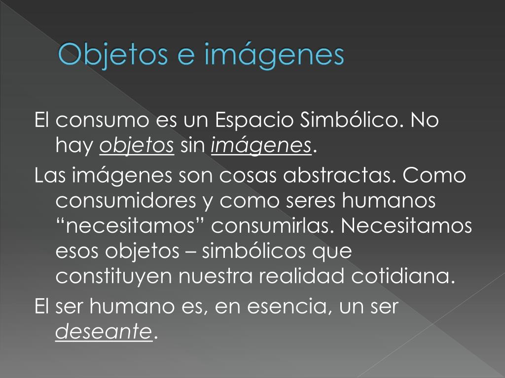 Objetos e imágenes El consumo es un Espacio Simbólico. No hay objetos sin imágenes. Las imágenes son cosas abstractas. Como consumidores y como seres humanos “necesitamos” consumirlas. Necesitamos esos objetos – simbólicos que constituyen nuestra realidad cotidiana. El ser humano es, en esencia, un ser deseante.