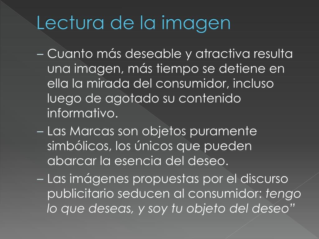Lectura de la imagen • Cuanto más deseable y atractiva resulta una imagen, más tiempo se detiene en ella la mirada del consumidor, incluso luego de agotado su contenido informativo. • Las Marcas son objetos puramente simbólicos, los únicos que pueden abarcar la esencia del deseo. • Las imágenes propuestas por el discurso publicitario seducen al consumidor: tengo lo que deseas, y soy tu objeto del deseo”