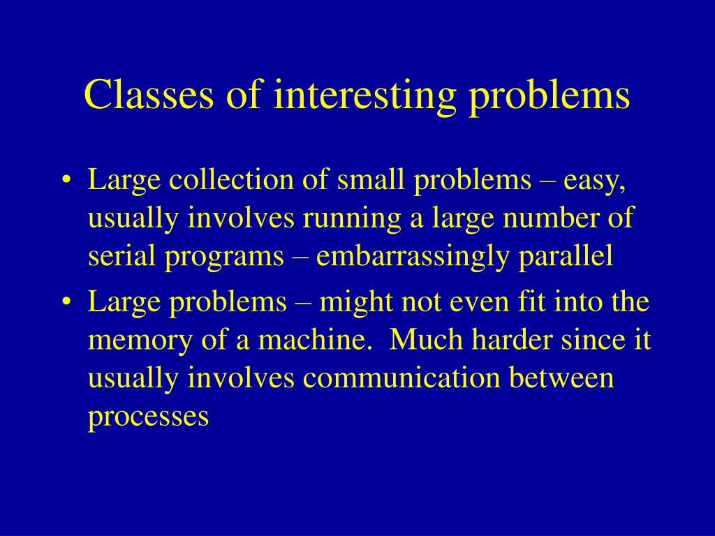 Classes of interesting problems • Large collection of small problems – easy, usually involves running a large number of serial programs – embarrassingly parallel • Large problems – might not even fit into the memory of a machine. Much harder since it usually involves communication between processes
