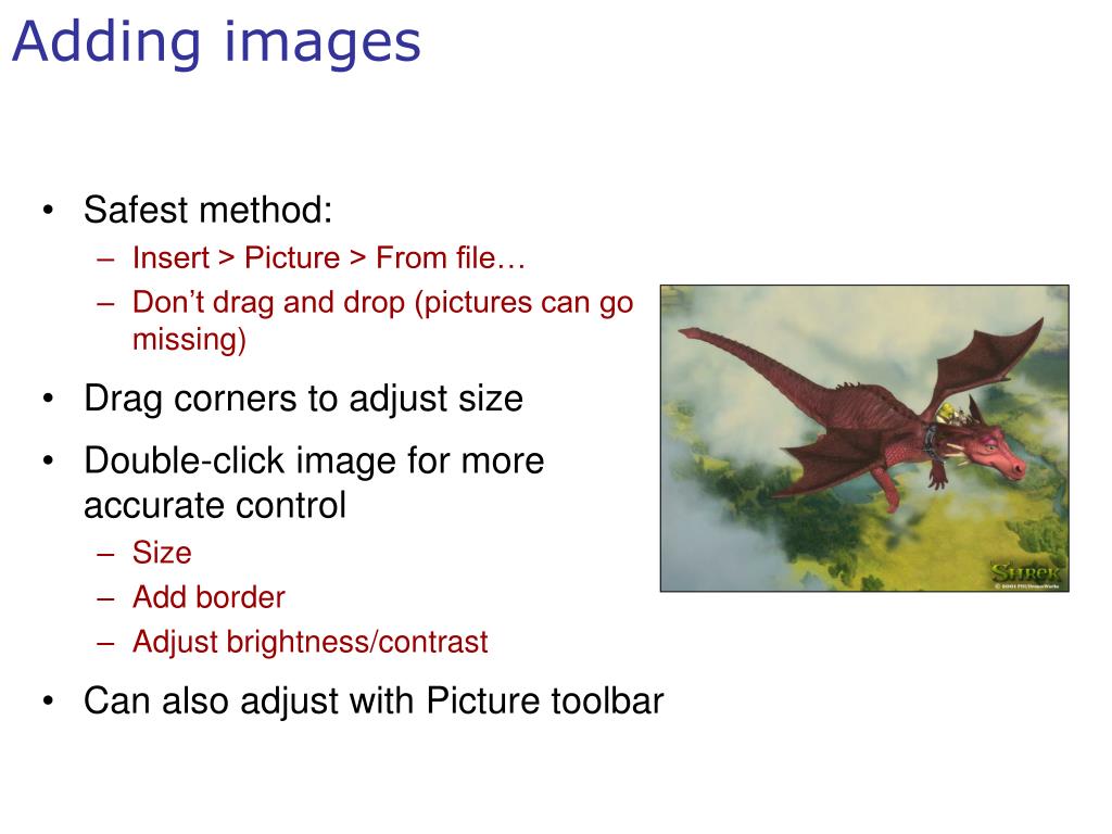 Adding images • Safest method: • Insert > Picture > From file… • Don’t drag and drop (pictures can go missing) • Drag corners to adjust size • Double-click image for more accurate control • Size • Add border • Adjust brightness/contrast • Can also adjust with Picture toolbar