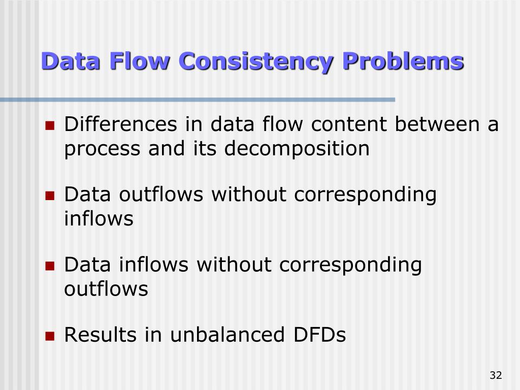 Data Flow Consistency Problems • Differences in data flow content between a process and its decomposition • Data outflows without corresponding inflows • Data inflows without corresponding outflows • Results in unbalanced DFDs