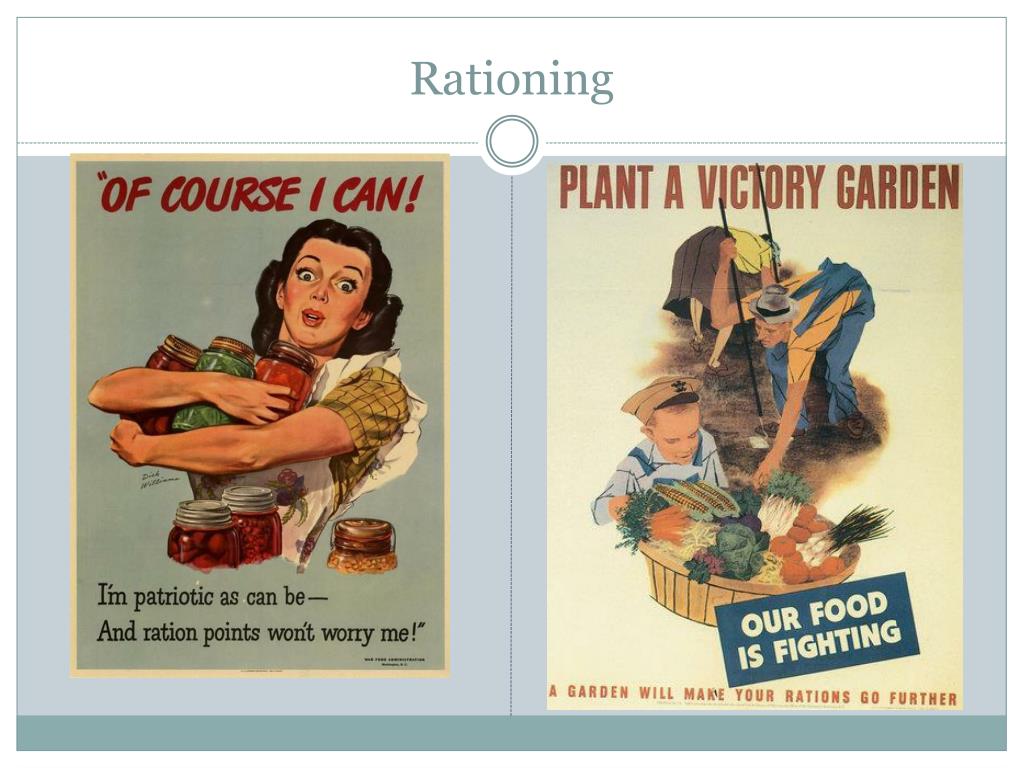 Rationing Since many goods were in short supply governments turned to rationing which is when people could only buy small amounts of certain goods that were needed for the war effort. People were encouraged to have their own gardens so they’d take less food away from the soldiers.