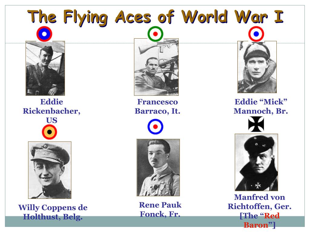 The Flying Aces of World War I Eddie Rickenbacher, US FrancescoBarraco, It. Eddie “Mick”Mannoch, Br. Manfred vonRichtoffen, Ger.[The “RedBaron”] Rene PaukFonck, Fr. Willy Coppens deHolthust, Belg.