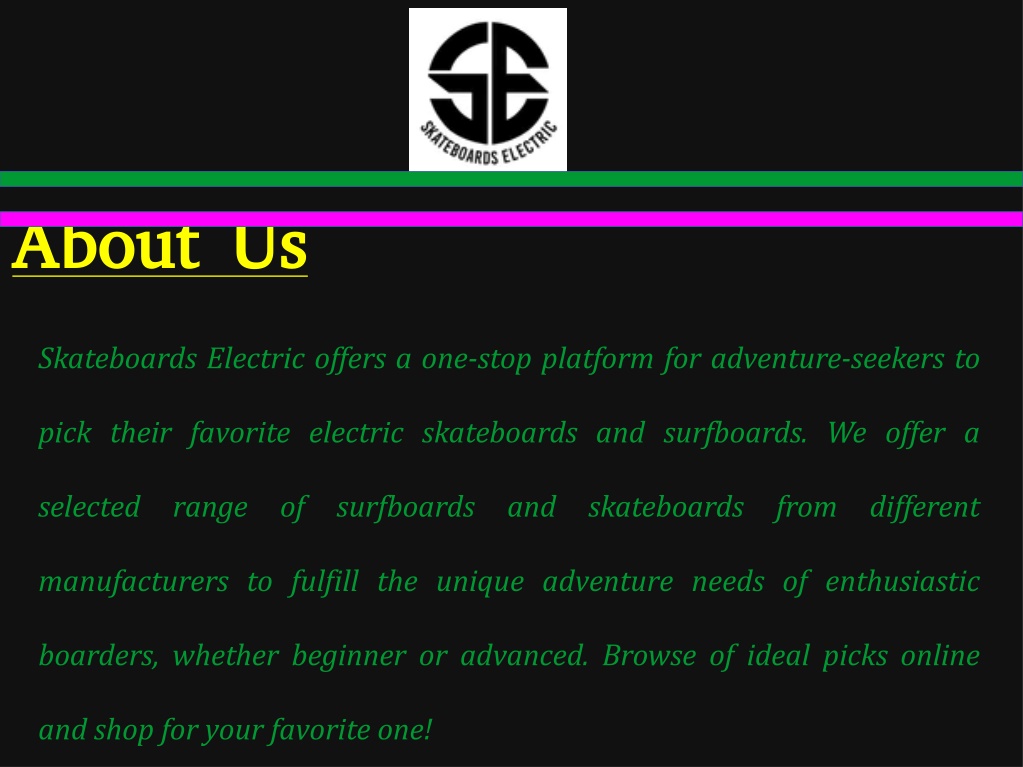 About Us Skateboards Electric offers a one-stop platform for adventure-seekers to pick their favorite electric skateboards and surfboards. We offer a selected range of surfboards and skateboards from different manufacturers to fulfill the unique adventure needs of enthusiastic boarders, whether beginner or advanced. Browse of ideal picks online and shop for your favorite one!