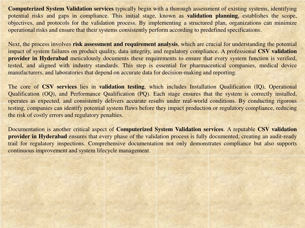 In today’s rapidly evolving technological landscape, ensuring the reliability and compliance of software systems is more critical than ever. Computerized System Validation (CSV) services play a pivotal role in confirming that computer systems perform as intended, adhere to regulatory standards, and maintain data integrity. Businesses in the pharmaceutical, biotechnology, and healthcare industries rely heavily on accurate and compliant systems, making CSV validation an essential process for operational success. A leading CSV Validation Provider Hyderabad offers end-to-end solutions to help organizations meet stringent regulatory requirements such as FDA 21 CFR Part 11, GxP, and ISO standards. These services involve a systematic approach that validates software applications, computerized systems, and critical equipment to ensure their reliability, functionality, and compliance with industry regulations.