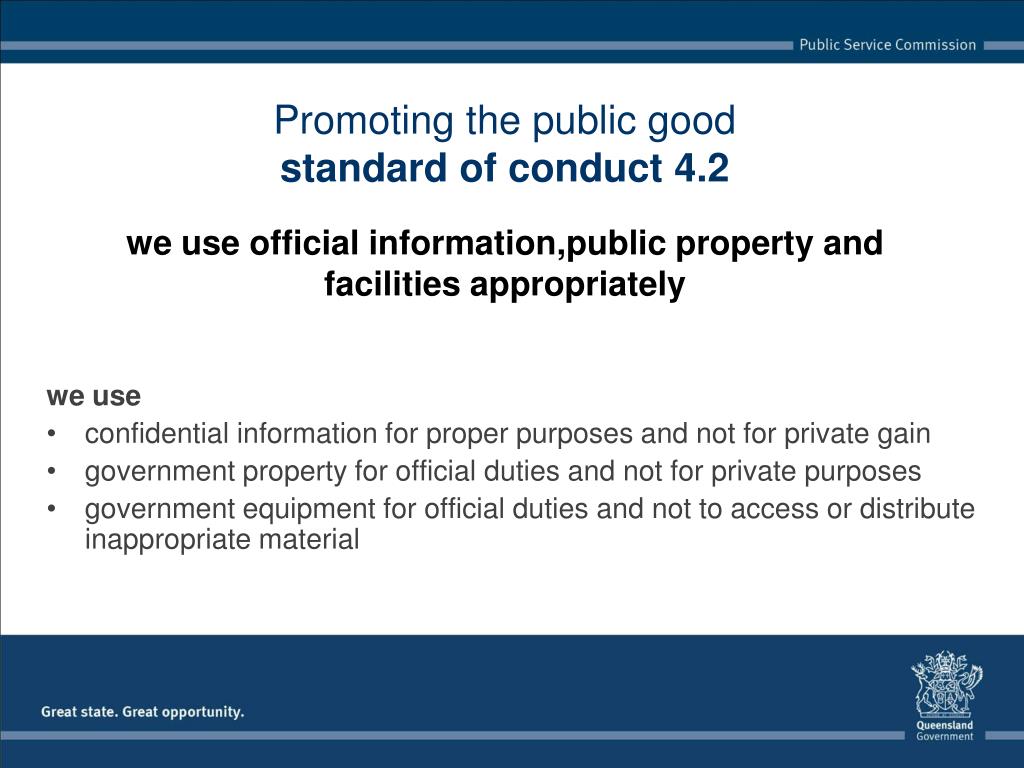 we use confidential information for proper purposes and not for private gain government property for official duties and not for private purposes government equipment for official duties and not to access or distribute inappropriate material Promoting the public goodstandard of conduct 4.2we use official information,public property and facilities appropriately