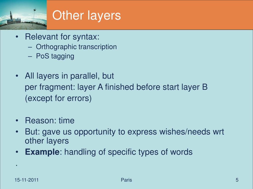 Paris Other layers Relevant for syntax: Orthographic transcription PoS tagging All layers in parallel, but per fragment: layer A finished before start layer B (except for errors) Reason: time But: gave us opportunity to express wishes/needs wrt other layers Example: handling of specific types of words .