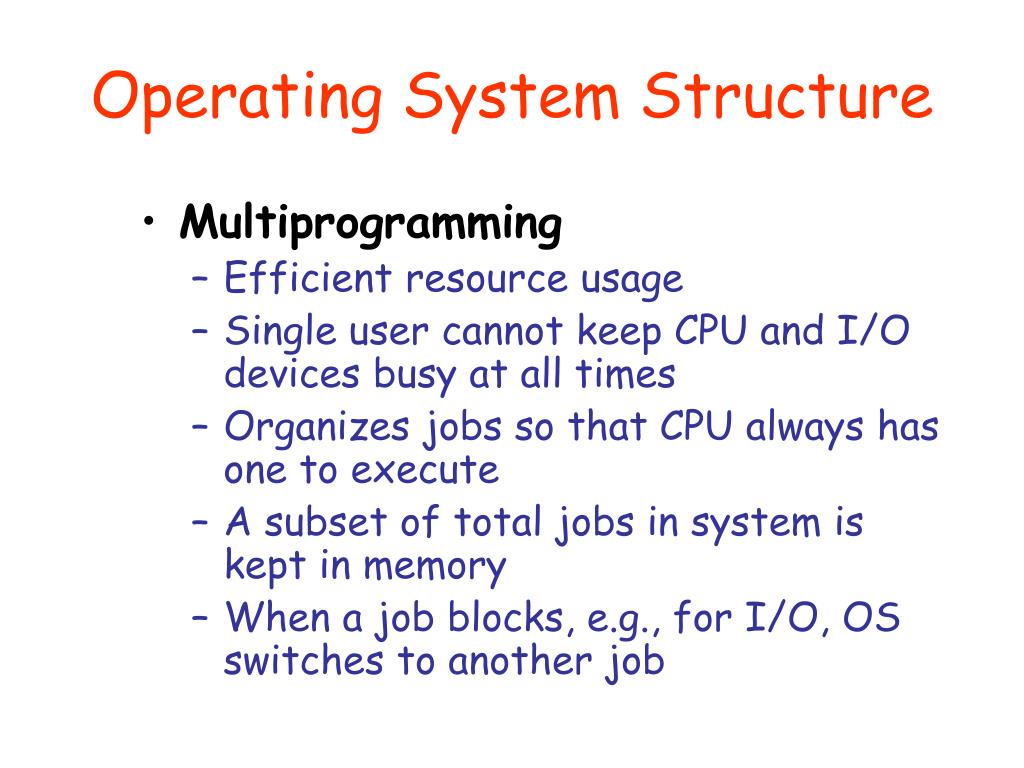 Operating System Structure • Multiprogramming • Efficient resource usage • Single user cannot keep CPU and I/O devices busy at all times • Organizes jobs so that CPU always has one to execute • A subset of total jobs in system is kept in memory • When a job blocks, e.g., for I/O, OS switches to another job
